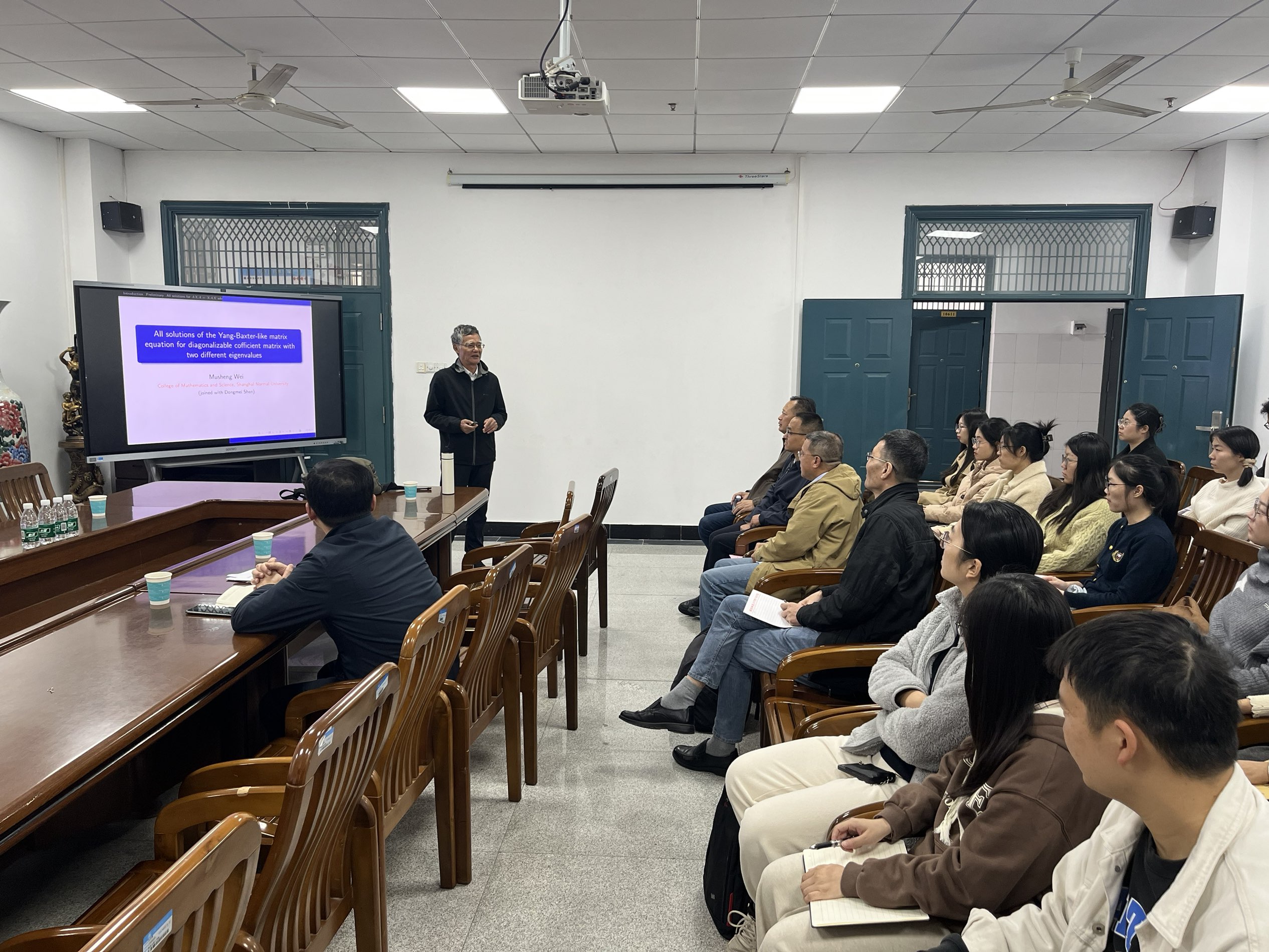 2025年10月25日,应湖北师范大学数学与统计学院邀请,上海师范大学魏木生教授来我院作了题为《具有两个不同特征值的系数矩阵的Yang一Baxter 方程的所有解》的学术报告。六合宝典官网 的部分青年教师和研究生参加了报告会。本次报告会由数学与统计学院院长姜国教授主持。