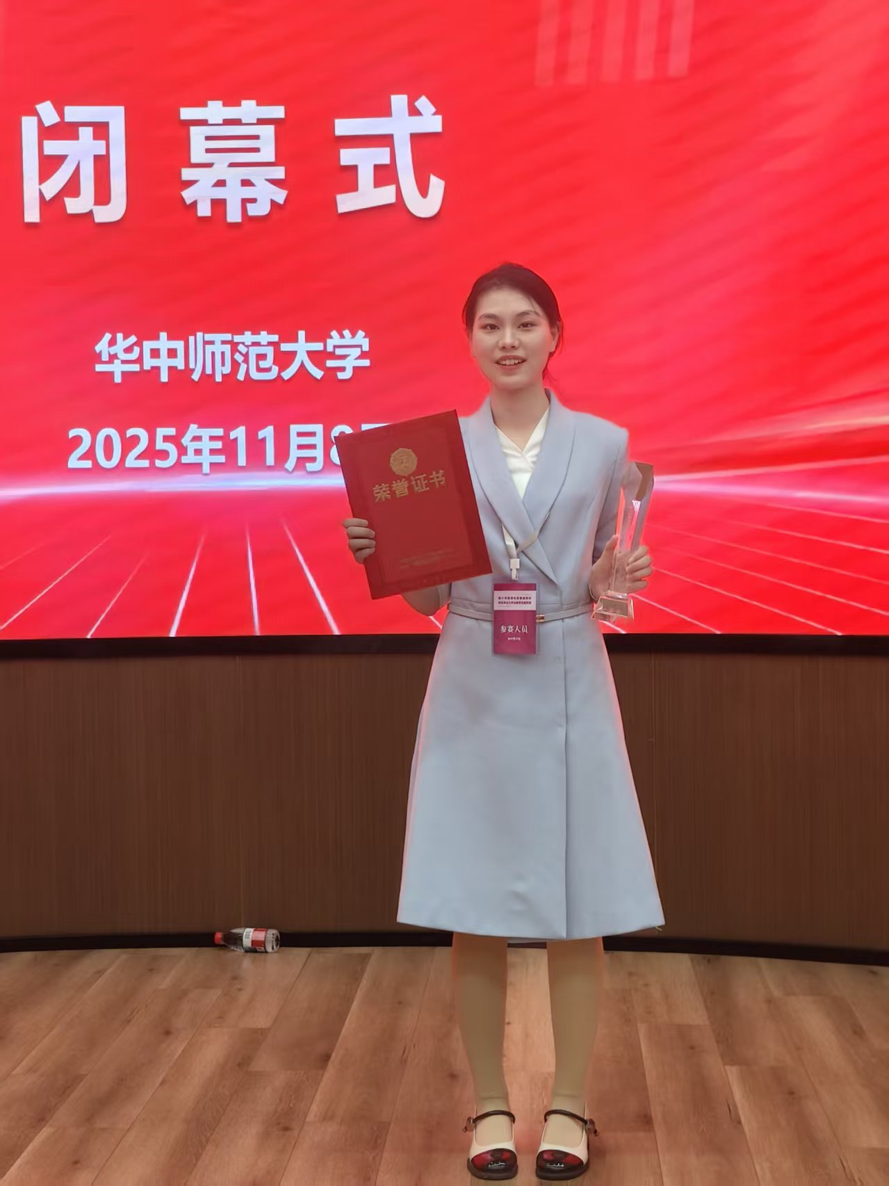 2025年11月8日,湖北省普通高校师范专业大学生教学技能竞赛决赛传来捷报——我院23级2301班夏颍慧同学代表学校出征数学组赛事,凭借扎实的教学功底与出色的现场表现,勇夺省级一等奖!