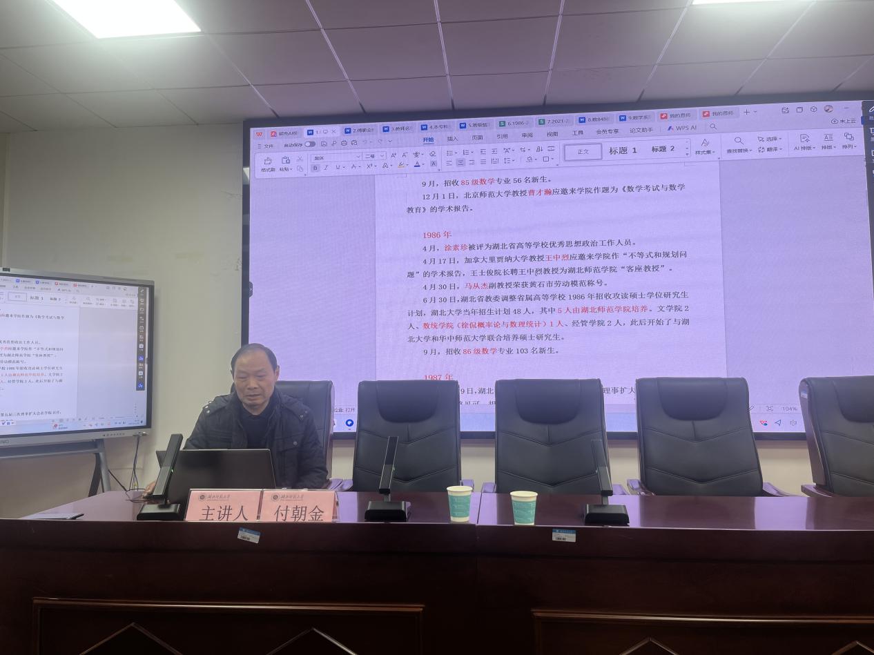 为回顾学院发展历程,弘扬学校优良传统,12月29日下午,在信息大楼10603举办“忆数统院院史 扬湖师大精神”专题报告会。学院退休教师付朝金老师应邀担任主讲,学院全体教职工参加了本次活动。