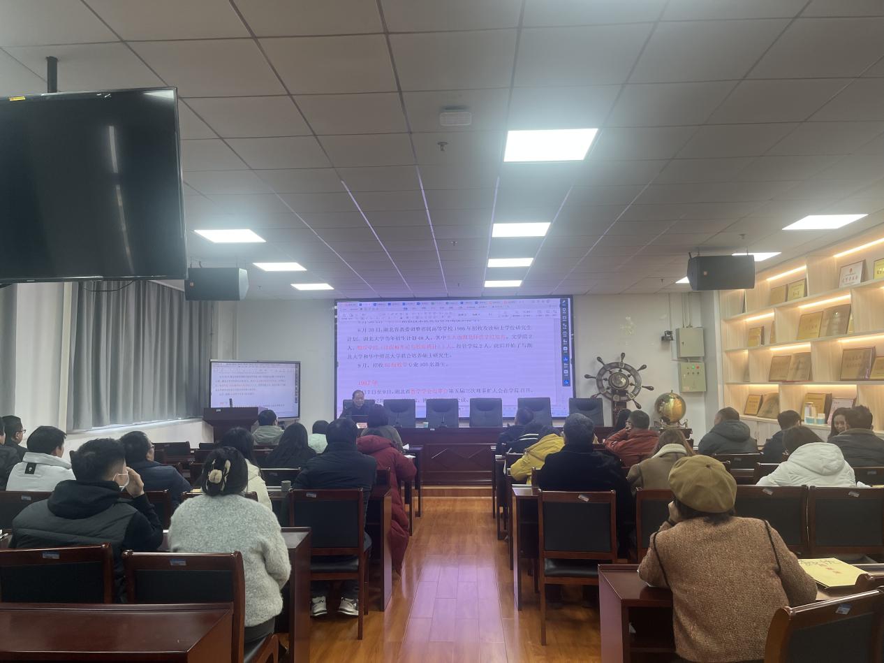 随后,他依时间顺序,结合丰富史料与个人见证,介绍了学院随后数十年的关键发展节点:包括1978年更名为黄石师范学院并开始招收四年制本科生、1985年更名为湖北师范学院、学科建设从单一到多元的发展、师资队伍中涌现的优秀学者与获奖成果、以及进入21世纪后学院在省级重点学科、硕士点建设、一流专业与课程申报等方面取得的一系列重要成就。付老师指出,学院的发展历程,是一部不断克服困难、勇于开拓、凝聚共识的奋斗史,也是学校整体发展的缩影。